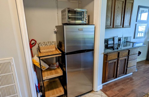 Kitchenette with a refrigerator/freezer, 2 burner glass stove top, toaster oven, microwave, and coffee maker