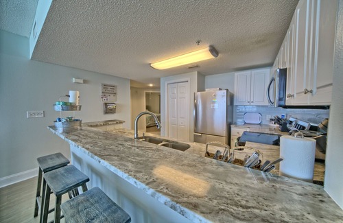This unit features a fully appliance well stocked stainless steel kitchen with granite countertops, in-unit washer and dryer, sleeps 8 comfortably (6 private + 2 on pull out sofa with queen mattress). The dining room seats 6 with 4 more at the side counter so everyone can enjoy eating together. The master bedroom has a king bed, flat screen TV, and a full view of the Gulf opening up to your own 27 foot balcony. The master bath features a double vanity, soaking tub, stand up shower, and private commode. The second bedroom also has a king bed and plenty of storage. The second bed also has direct access to the second bath, making it feel like another master suite. The third bedroom has a full bed with its own flat screen TV perfect for adults, teens, or younger children (no bunks). The large living room has a jumbo flat screen TV, and opens to the private balcony looking directly onto the beach with no obstructions so you can enjoy every sunset. This unit features plank and tile flooring with fun soothing colors throughout. The unit and balcony are smoke free so you can enjoy the fresh air at every turn, we were so inspired we even nicknamed the property SaltAir.