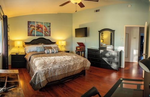 Master Bedroom: Features a queen pillow top bed (you won't want to get out of bed in the morning!). Relax by listening to the Beach Boys or Bob Marley's greatest hits on the old fashioned record player or catch up on your favorite shows from Netflix, Prime Video, Hulu, Disney+, or get the latest sports updates with ESPN! There's a large shower with shower head, a sunken Roman tub (perfect for soaking away the worries of the day) a vanity with two sinks, ample lighting, a very large walk-in closet space with hangers, and a laundry hamper. There's a huge full-length mirror and dresser, a vanity with special lighting, curling iron, and hair dryer (no need to bring your own) and a desk workspace. We provide hampers, an ironing board, iron, steamer, candles, shower amenities, and plenty of extra towels.