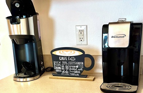 The fully stocked kitchen makes mealtime easy, with all the essentials: utensils, a coffee maker, tea maker, pots and pans, mixing bowls, glass baking trays and even an air fryer. Whether you're planning big family meals or a cozy breakfast before hitting the parks, we’ve got you covered.