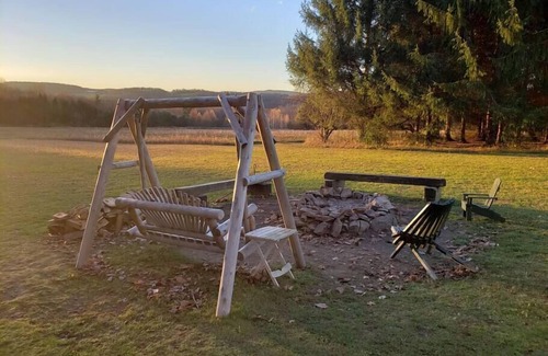 In the warmer seasons, enjoy the large front yard complete with provided outdoor sporting equipment and a volleyball area. There’s plenty of room for almost any outdoor sport you can think of. Sit back and relax on our 500-square-foot deck, complete with a propane grill and picnic table. Sip your favorite beverage while enjoying a panoramic view of beautiful mountain ridges. Or, grab your swimsuit and a fishing pole and head down to our lake. At night, unwind around the large fire pit while enjoying smores and listening to the summer night’s sounds including the soothing burble of the Pike Run stream that runs through our property. Stargazing is stunning!