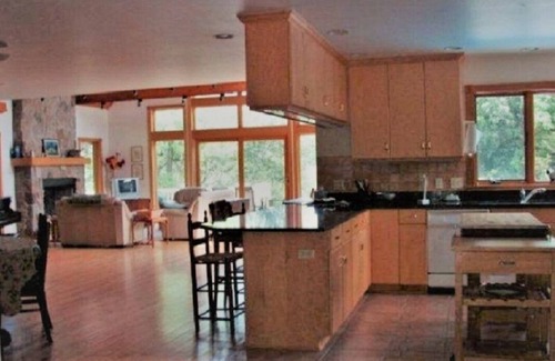 Our 4-bedroom, 2.5-bathroom home can comfortably sleep ten guests. Please note the full list of amenities. The kitchen is equipped for larger groups