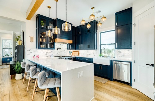 Head upstairs to the large main level deck for more cozy seating, perfect for enjoying your morning coffee. The wall of windows welcomes you inside, where you’ll find bright & airy open living & dining spaces. A bold teal couch and comfortable side chairs, all in luxe fabrics are the perfect spots to catch up on your favorite shows or family stories. The nearby dining table seats 10 comfortably with a mix of chairs and bench seating. 4 additional guests can pull up a stool at the kitchen’ breakfast bar, complete with a waterfall edge countertop. The fully equipped kitchen features stainless steel appliances, a coffee bar, rich navy cabinets for plenty of storage, gas range, and a French door refrigerator ready to chill your favorite beach food.
