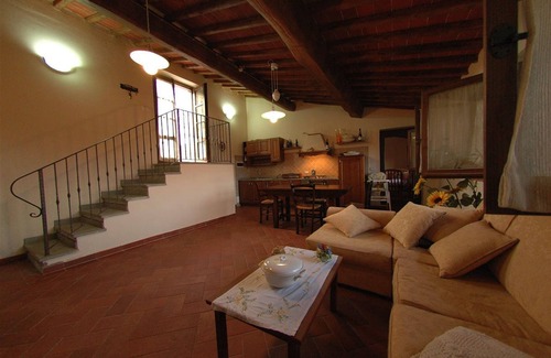 Inside, both apartments have terracotta tiled floors and the typical Tuscan tiled and beamed ceilings throughout. The entrance to the first floor apartment opens into the spacious lounge / kitchen / diner, a short flight of six steps lead down into this airy room.