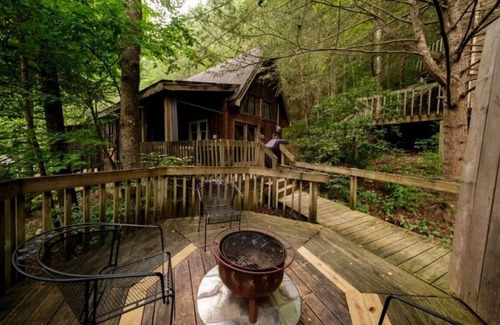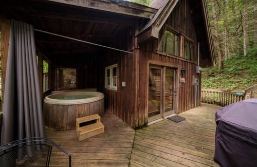 The Chalet of Quiet Waters is part of a five cabin complex connected by decks and wooden staircases. Perfect set up to bring friends or maybe you just want to be close to the heart of it all! Set in the heart of Natural Bridge State park close to restaurants and activities on Rt 11. Enjoy the Skylift, swimming pool, hiking trails, Underground Kayak tours. Walk to trails at the state park. This chalet has 2 floors with loft bedroom on second floor with a queen bed. May sleep up to 4 if the sleeper sofa in the living room is used. Comes with window AC, satellite Wi-Fi, Flat screen TV with Satellite TV, gas log fireplace, oven/stove, coffee maker, refrigerator/freezer, toaster, microwave. Cabin has bed linens, hand towels, dish towels & one bath towel per person. Outside is a gas grill, firepit with seating for all and a 5-6 person hot tub (hot tub is within view of public wooden staircase and Middle Fork Lodge). If you seek a more private hot tub we recommend the Butterfly Suite or check out other "Two Bedrooms Cabins" under Scenic Cabin Rentals.