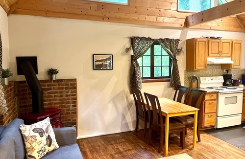 This original mountain cabin has comfortable queen size beds in both the bedroom and loft area. The loft also has a sitting area, futon, tv & large windows with views of surrounding trees. The kitchen, dining, and living area flow together for an open but cozy gathering space. There is a propane stove in the living room for a cozy fire on cold days. Coffee, tea, olive oil, and salt & pepper are provided. The kitchen is stocked with cooking essentials if you want to stay in and cook. The full bath provides a shower tub combo.
