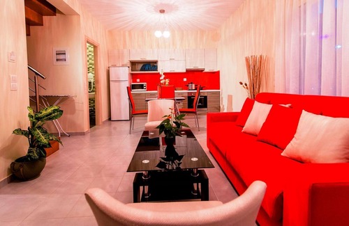 Independent residence can accommodate 2-5 people in comfort and luxury. Extending on two levels aims to serve a family and to satisfy all the guest’s senses.The first level is dominated by the imposing living room, the kitchen and a bathroom.Upstairs a large bedroom with king-sized bed and aesthetics as well as the second bathroom of the house, equipped with hydromassage cabin (hydromassage).
