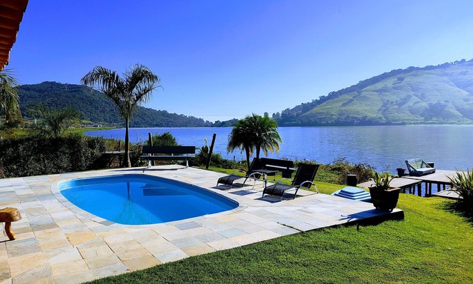 In a quiet and familiar area, with a beautiful view of the Lake, the Rancho has a suite with a Queen bed, plus a spacious bedroom with a double bed, two bunk beds plus a single bed, social bathroom, living room, dining area , fully equipped kitchen with refrigerator, microwave, electric oven and utensils, wifi, OI TV, barbecue area next to the pool, balconies and a fishing deck!