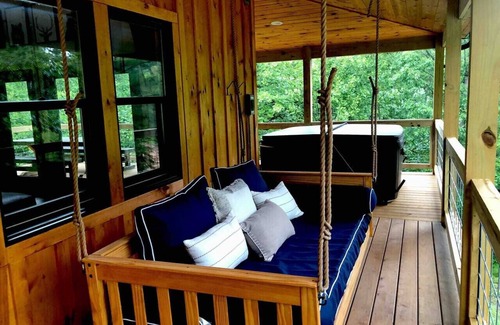 On the wrap around deck, you will find cozy seating areas, a porch swing to melt away your worries, a daybed swing for an afternoon nap and a huge hot tub.