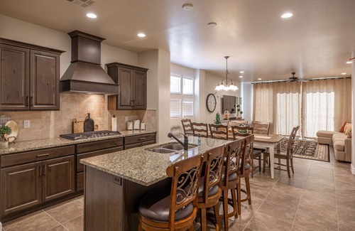Welcome to 'Red Rock & Turned Wood Escape,' a 2,692 sq. foot, 4-bedroom, 4.5-bathroom luxury villa featuring a private hot tub. Our home is elegantly furnished with all the upgrades you desire, including flat-screen HDTVs, granite countertops, and stainless steel appliances. The spacious floor plan boasts private bedrooms, each with its own bath, ensuring a comfortable and secluded retreat.