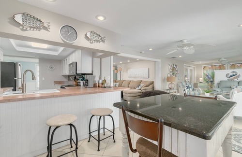 There is a beautiful sun room with a wall of large glass sliders that allow the sunroom to be opened to the screened lanai. Enjoy your coffee watching the morning news on TV or breakfast on the screened lanai with a dining table and plenty of cozy seating. The lanai overlooks the canal, pool and huge travertine patio and game area. The backyard is fenced on 3 sides, plus it has a secure completely fenced safe pet area. There is a floating dock and some fishing poles for your use. You can cruise the canals or grass flats in the 2 kayaks that are provided. We have bikes for a ride around the quiet neighborhood or a quick trip to Public's grocery. The Pelican Place is located on a low traffic quiet street. The new large salt water pool has a huge sun shelf with a shade umbrella for lounging and kids play. Beach chairs and pool towels are provided. Heating the pool is optional. Beautiful lighting at night creates a tropical resort experience around the pool.
