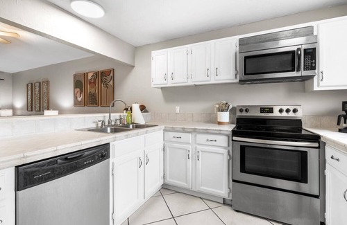 Step inside to find a bright, open-concept living space with modern furnishings and thoughtful touches throughout. The living room features a sleeper sofa and two twin sleep chairs, perfect for extra guests, while the full-size kitchen comes equipped with everything you need for easy island living — from brand-new cookware and dishes to a combo Keurig coffee maker for your morning brew. Condo also features central air conditioning to keep you cool throughout your stay!