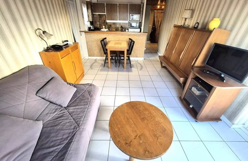 Accommodation: Very beautiful mountain view for this very quiet 2-room apartment close to shops. On the 8th floor with elevator, in Basic Range Classification in furnished tourist accommodation in 2* Surface area of approximately 40 m² facing East, North and West on balconies (furnished) Entrance hall (tiled floor) Living room (tiled floor): 1 BZ sofa bed, 1 table, 4 chairs, 2 storage cupboards, 1 flat screen television, 1 DVD player, 1 CD/cassette radio. Bedroom (laminated parquet floor and wall fabric): 1 140 cm bed, 1 wardrobe with 3 wardrobe doors/shelves, 1 built-in cupboard, 1 alarm clock radio American kitchen open to living room (tiled floor): 2 electric beds, oven, microwave, fridge freezer, electric coffee maker, kettle, toaster, crockery and kitchenware Bathroom (tiled): shower, sink, washing machine, bathroom cabinet. Independent WC (tiled floor) Rented with Parking No. 100, going up to the right of the building MISCELLANEOUS: Intercom/Videophone - Collective heating, smoke detector, Column fan, Internet access "Orange Box" Additional services at extra cost: end-of-stay cleaning, bed linen, bathroom linen, animals, baby bed (subject to availability on request).