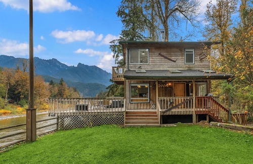 Experience serenity at this cozy wilderness retreat, perched on the banks of the Skykomish River. Slip into the luxurious salt water hot tub and take in breathtaking mountain views with the river flowing just feet away. Also, enjoy the relaxation and health benefits of the new four person barrel sauna. The two lush lawns give ample outdoor space and lots of room to roam the property for you and your furry friends. Plus stay warm, even outdoors, with a smokeless fire pit in the gazebo or a wood stove inside. The newly remodeled kitchen comes fully stocked for your cooking needs and has all new appliances. Our Starlink WiFi is fast and you have access to some live TV as well as streaming options on the Roku TV.