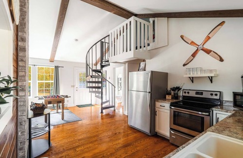 Whether you’re roasting marshmallows by the oversized fire pit, soaking under the stars in the 5-person hot tub, or exploring the property’s hangars and wooded trails, Runway Retreat blends whimsical aviation charm with upscale modern design.