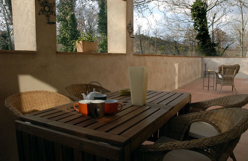 Beside a small river, 2. 5km from the village, with private terrace and green spaces around near our vineyards, dolmens, fields, olive groves and mountains.