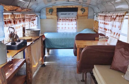 The bus overlooks the horse pasture, as well as the salt lakes. It is equipped with solar power, a stove, hot shower, and WiFi. There is also an outdoor seating area where you can enjoy a coffee while watching our horses roam through the field.