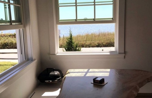 The cottage was built in 2018 and is incredibly cozy with unobstructed views of Mayo Beach and Wellfleet Harbor. It also has excellent privacy and high-end amenities. The house includes central heat and air conditioning in each bedroom as well as the living room. It has a modern kitchen with a beautiful dining nook.