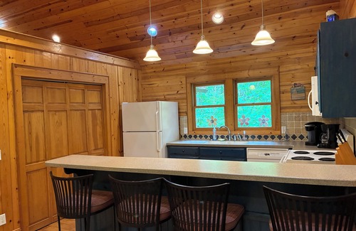 The custom-built cottage sleeps up to 10 people. It boasts a stacked rock wood-burning fireplace in the main living area, perfect for a fireside chat or cozy, cool evenings. The open floor plan has an equipped kitchen, countertop seating, a dining table, and a comfortable living space under the vaulted ceiling. The open-air deck and patio beckon you to commune with nature as you enjoy morning coffee among the trees.