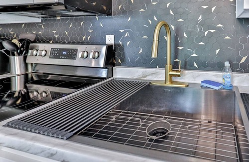 -Kitchen: Fully equipped with refrigerator, freezer, electric stove/oven, microwave, toaster, coffee maker, crock pot, pots, pans, utensils, dishes, and cleaning supplies
