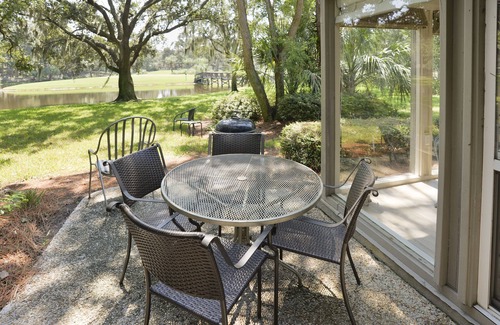 Enjoy a relaxing Sea Pines vacation while staying at this beautifully decorated, ground level villa with an open floor plan and breathtaking rear lagoon view. Just a quick 5 minute walk to our beautiful Atlantic Ocean beaches-just use beach access #45 just across N. Sea Pines Drive. The bridge over the lagoon in back ends at a well maintained practice putting green that you can use. 1/2 mile to 600 acre forest preserve with horseback guided tours daily and electric boat echo tours. Bedroom configuration is King in Master and 2 double beds in guest bedroom.
