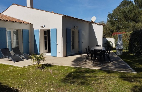 -a rent all seasons pretty Charentaise holiday villa on the ground floor with garage, terrace and enclosed courtyard, at the foot of bike paths, 700 m from shops and 1.5 km from the sea, in a quiet and wooded residence, which can accommodate 8- 9 people, including: