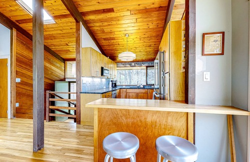 Chilmark is for lovers of the beach and the great outdoors, and this private, light-filled home offers a gorgeous, mid-century-inspired setting to help you make the most of your beautiful surroundings. Comfortably outfitted with unfussy furnishings, enormous windows, and a spacious mahogany deck, this home is the perfect place to spend peaceful country mornings and golden hours with a peek of the ocean. Wash off after a day spent at the beach in the lovely mahogany outdoor shower, marvel at the view of the trees through floor-to-ceiling windows, or relax on the open main level beneath an all-wood cathedral ceiling. When your guests are hungry, the group chef will love the all-new (2023) kitchen, which features soapstone countertops and stainless steel appliances that include a Bosch refrigerator and dishwasher.