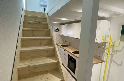 Access to the kitchen (new in 2023) via a sliding door, fully equipped with: ceramic hob, dishwasher, oven, microwave, extractor hood, refrigerator/freezer, and cupboards.