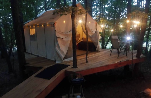 Incredibly Pet and Family Friendly. The shower house is a treehouse. There is an outdoor kitchen that is shared, that has a large blackstone griddle running drinking water & 3 burner stove. Exploration of our woods is really encouraged, we have 3 miles of trails. Situated very close to local, state trails, waterfalls and forests. We are in between Nashville and Gatlinburg TN, up on the Cumberland plateau. Your parking space will be about 180 feet from the tent Our workshop/home is close to the shower house if you should need anything