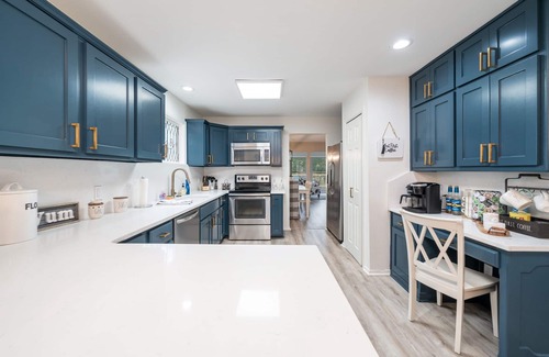 Enter into an open and inviting living space that seamlessly connects the kitchen, dining, and lounge areas. The home’s stylish decor and comfortable furnishings make it the perfect spot to gather with family or friends. The fully equipped kitchen, complete with modern appliances, a Keurig, and a complimentary coffee bar, is ready for any meal, from casual breakfasts to elegant dinners.