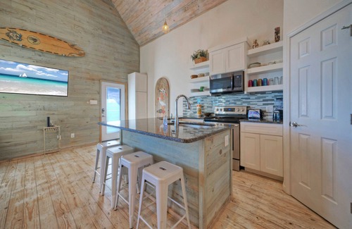 Inside, the modern, fully-equipped kitchen boasts a large counter with 8 barstool seats, perfect for enjoying meals with the entire crew. With stainless steel appliances, it's a chef's dream, allowing you to whip up your favorite home-cooked meals after a day of seaside adventures.