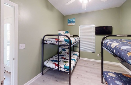 Our spacious three bedroom, two bathroom town home is fully equipped with every necessity. Our fully stocked kitchen with stainless steel appliances is ready for your favorite family recipes. You will find a king bed in the master, another king bed in the 2nd bedroom, and 4 twin beds arranged in bunks in the 3rd bedroom. There is a private bath for the master bedroom that has a separate tub and shower. The other two guest baths have shower/tub combos. One of which is on the 3rd floor and the other is on the 2nd floor.