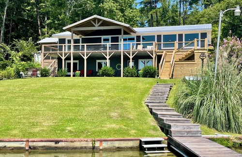 Renovated and up-to-date 3 bed and 3 bath home just steps down a gently sloping yard onto a walk board, leads you to the crystal clear water of Lake Martin. A massive oversized pier with 5 loungers gives you plenty of room for laying in the sun or a table for 6 under the gazebo when it’s too hot! Our house gives you plenty of options. On the main level, you will have plenty of room for family in the open great room, kitchen with coffee and wine bar and dining table for 8, seating for 4 at the island gives you lots of options. Down the hall, is a full bathroom, a laundry room, guest bedroom with a queen bed and the primary bedroom with a king bed and private bath at the end of the hall. Down a flight of stairs to the lake level is another bedroom to the right with a king bed and adjacent second living area with your choice of pullout sofa with queen mattress that sleeps 2 or a Murphy Bed with queen bed that sleeps 2. Inside the round metal cocktail table are sheets pillows and blankets for both. A full bath with shower is adjacent and door to lake completes the downstairs space!