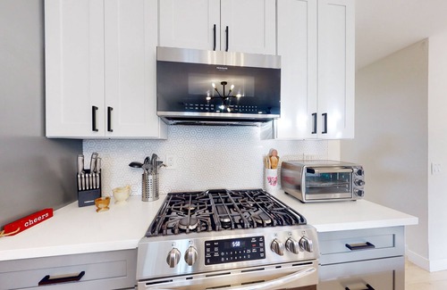 Begin each morning with a cup of coffee on the swinging bench in the backyard, then head into the kitchen to get started on breakfast. This sleek space features stainless steel appliances (including a gas stove and a French-door fridge), reverse-osmosis water, and an open view to the rest of the living area. Enjoy a bright dining space, bold pops of color in the living room, and a smart TV for your evening entertainment.