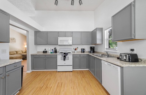 The kitchen is equipped with all the essentials, including all major appliances and just about everything you should need! Silverware, dinnerware, plasticware (for the pool and for kids) as well as most small appliances! Toasters, blenders, microwave, pots & pans, can openers and the standard essentials are supplied! There's even a breakfast table with 4 highchairs for extra space or a quick morning bite.