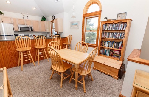 Top Level: Great room with TV/DVD, kitchen with counter seating for 4, dining room seating for 12, and a King Master Bedroom with TV/DVD and deck access.