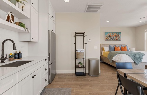 Southwest Casita offers the perfect desert escape in the heart of the Desert Color community—just steps from the 2.5-acre lagoon. This cozy 1-bedroom, 1-bath retreat sleeps four and features a convenient kitchenette, smart TVs, and easy access to all the action.