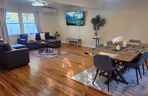 Your home away from home in Hicksville with 4 bedrooms. This lovely house features 3 queen beds, 4 twin beds, and 1 king bed, perfect for a peaceful getaway. With amenities like individual controlled room heating, AC, and a jetted bathtub, guests will feel right at home. The welcoming living room with a sofa bed offers extra space for relaxation. You're sure to make fantastic memories with a stay at our place.