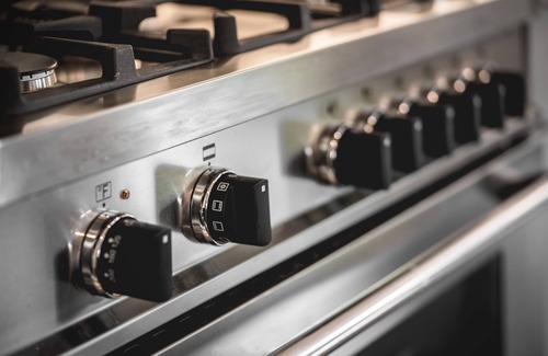 Off to your right there is an open concept kitchen with a 10 foot island with seating for 4 and tons of white quartz counter space! The appliances are all top of the line with a 36" Bertazzoni gas range for any chefs or bakers in the group. The kitchen has everything you could need for a large home cooked group meal including cutlery, serving dishes, plates, baking tools and gadgets and much more. The kitchen is open to the living room which has a 75" TV mounted above a gas fireplace. Since we know this home is perfect for large groups we knew we would need to do better than the other homes that only have a small couch or two and a couple of chairs in the living room (seriously, where is everyone supposed to sit?!) so this house we have a huge U-shaped sectional with extra pillows and faux fur blankets great for napping or watching movies and can seat your whole group. The door to the deck is between the living room and dining room.