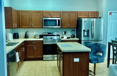 Stay comfortably in Kissimmee at this 6-bedroom house. With 2 king beds, 2 queen beds, 2 twin bed, and 1 bunk bed, 14 persons can sleep comfortably, this property offers a terrific space for guests to relax. Enjoy the pleasant amenities like AC, heating, heated pool, game room, dryer/washer, full kitchen, 2 living rooms and a public fitness room. The 5 bathrooms come equipped with hair dryers and a bathtub for added convenience. We have 24 hours security standing in front gate , We'll be available to answer any questions while you stay at our place.