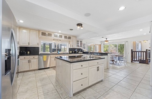 This spacious home on Table Rock Lake has 8 bedrooms and 3 bathrooms that sleeps 22. Enjoy a private hot tub on the upper deck that overlooks Table Rock Lake, fireplace, large sunroom/game room with pool table, along with a large commercial style kitchen. The downstairs features a private home theater and bar area. Note - there are single steps up and down from room to room.