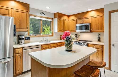 Inside, you'll be welcomed home from your adventures by a spacious and heated mud room and laundry area, where you can leave your gear. The main living area is open and inviting, offering wood floors, new furnishings, lofty ceilings, and a wood-burning fireplace to take off the winter chill. Enjoy a well-equipped kitchen with stainless steel appliances and an island breakfast bar, a formal dining room, and an office with a desk, a printer, and high-speed WiFi.