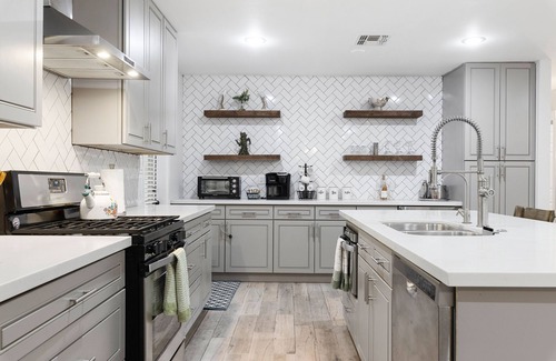 Upon entering our home, you are welcomed by a vast, open-concept, 1829 sq. foot interior, accentuated by lovely artsy wall decorations and a massive 75” HDTV as the centerpiece. Bask in the cool serenity of air conditioning, sink into the plush furnishings, and appreciate the expertly chosen amenities and appliances that improve both the aesthetic and functionality of the space.
