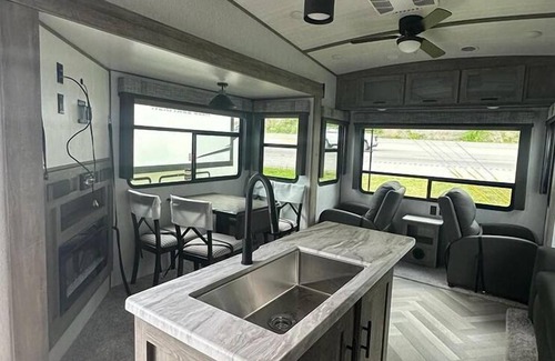 This spacious and modern RV has all the features you need for your next adventure! It can sleep up to 8, with a spacious modern interior, featuring modern appliances, a private Master bedroom, and even an island sink. The Kitchen is equipped with a refrigerator, stove, and microwave. And let's not forget about the private bathroom with a shower and abundant storage for your storage needs. Plus, the large panoramic windows provide amazing views of the great outdoors.