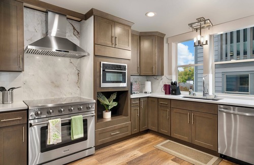 Our beautiful house offer 2,830 sq. ft. of thoughtfully designed space perfect for up to 12 guests. This stunning home boasts 4 spacious bedrooms, each with its own en-suite bath for ultimate privacy, plus a convenient first-floor in-law suite ideal for families or groups. Step inside to find elegant hardwood floors, an open layout bathed in natural light from oversized windows, and a beautifully appointed chef’s kitchen complete with quartz countertops, upgraded cabinetry, a double refrigerator, and premium stainless steel appliances. The inviting living area is perfect for both relaxation and entertainment, featuring a cozy seating area, a foosball table for family fun, and a dedicated workspace for those needing a quiet corner. Whether you’re enjoying a meal at the countertop bar, cooking up a feast, or simply unwinding, this home’s blend of style and comfort ensures an unforgettable Seattle stay.