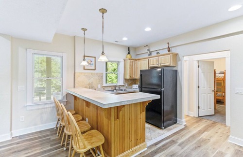Ground Level: 3 king en suites with private baths, 2 en suites with 2 bunk beds each and a private bath, recreation room with a pool table and Smart TV, kitchenette with a raised bar, refrigerator and a dishwasher, laundry closet, half bath, pool access.