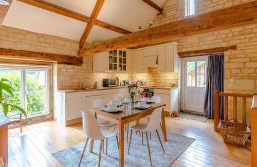 Head up two stone steps, through the front door into the open plan living space where there is a living area, kitchen and dining area with beautiful wooden flooring from end to end. Guests will be immediately impressed by the cottage's high ceiling, the original timbers of the barn's A-frame, and the exposed Cotswold stone walls.
