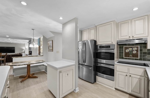 The bright kitchen is fully equipped to handle any occasion, whether it's an elaborate holiday feast or simply feeding a growing family. Keep the kitchen stocked with all their favorite drinks and snacks because you have all the space you need. The kitchen's built in table offers the perfect space for your everyday meals, quick snacks, and breakfasts. The adjacent dining room is great for sit-down family style dinners and is elegantly furnished, making it the perfect setting for even the fanciest occasions.