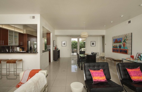 Updated Mid Century condo located in the Seven Lakes Country Club, designed by Richard Harrison and built in 1964. This complex boasts many amenities such as swimming pools, seven lakes, and an 18-hole golf course that guests can use for a nominal fee. Additionally, the clubhouse offers formal dining, a fun bar area, and outside patio dining. The tennis courts also function as pickleball courts. Our condo features the style of the 60s with modern conveniences such as a gourmet kitchen, beautiful bathrooms, flat-screen TVs, wireless internet, private courtyard entry with front and rear patios, and Nest-controlled air conditioning and heating. With an open floor plan, a spacious kitchen with granite countertops and a wet bar, two sitting areas, two bedrooms, two bathrooms, and loads of closets, this condo is both special and stylish and Includes some vintage furniture by Knoll and Platner. Don't miss the opportunity to enjoy a piece of history in this desirable community which is in a fabulous location close to the Parker Hotel and great Palm Springs Restaurants and shops.