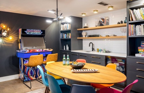 The lower level is designed for both entertainment and wellness, featuring a family room with a ping pong table, oversized TV/projector, and a vintage arcade game. A steam room and custom-equipped gym provide spa-level comfort, while the fifth bedroom—with its own lounge area—offers added privacy. A full bathroom located just outside the bedroom completes this level.